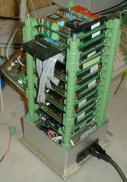 As you can see, there are only four nodes in this cluster. The base of the cluster is the power supply, and the cluster requires 120 Volts AC to run. We also show a single CPU card on the right. The green pieces at each corner form the stack shown in the pictures. A system very much like this one is now sold as a product by Parvus Corporation.