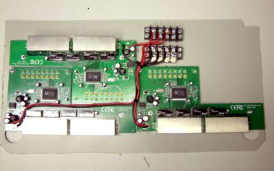 With this fix, we now had a stack that was spaced correctly. The stack shown above was finished off with a Parvus OnPower-90 power supply and a Parvus fan board, which you can see at the top. This supply can provide 18A at 5V, more than enough for our needs, as well as the 12V needed for the switch.