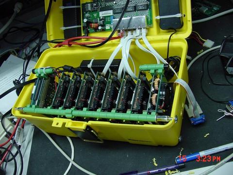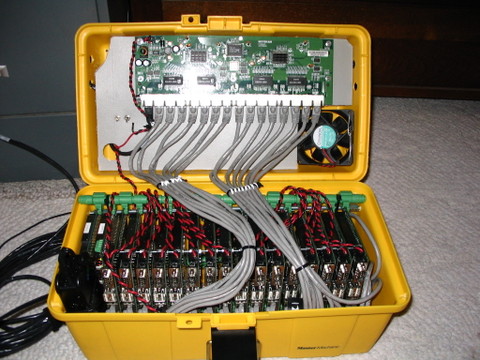 Inspired by Mitch's work, we built our first Bento cluster in 2002. In fact, the lunchbox used for that system is the one we use for the Ultimate Linux Lunchbox. This system had seven CPU cards. It needed two power supplies, made by Parvus, which generate the 5V needed for the CPU cards and can take 9–45 VDC input. It had a built-in Ethernet hub, which we created by disassembling a 3Com TP1200 hub and putting the main card into the lid. This cluster used three IBM ThinkPad power supplies. Two of the supplies are visible in the lid, on either side of the Ethernet hub. The third is visible at the back of the case. One supply drives the hub, the other two drive each of the two supplies. The supplies and fan board for each supply can be seen at the far right and left of the box; the seven CPU boards are in the middle.