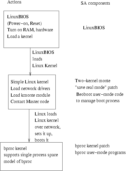 The boot sequence, as shown, consists of LinuxBIOS, Linux, Linux network setup, Linux loading another kernel over the network and Linux using the kmonte system call (part of Clustermatic) to boot that second kernel as the working kernel. Why are there two kernels? In Clustermatic systems, we distinguish the OS we use to boot the system from the OS we run during normal operation. This differentiation allows us to move the working kernel forward, while maintaining the boot kernel in Flash.