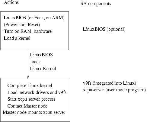 The new boot sequence is shown in Figure 15. If it looks simpler, well, it is. We no longer have a “boot kernel” and a “working kernel”. The first kernel we boot will, in most cases, be sufficient. Experience shows that we change kernels on our clusters only every 3–6 months or so. There is no need to boot a new kernel each time. Because the 9p protocol and the xcpu service don't change, and the Master node kernel versions are not tightly tied together, we can separate the version requirements of the Master node and the worker node. We could not make this kind of separation with bproc.
