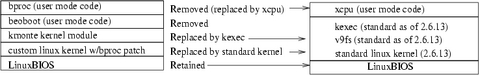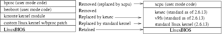 Fortunately, the timing for this move is good. As of 2.6.13, there is now support for the Plan 9 protocol in the standard Linux kernel. This module, called 9p (formerly v9fs), supports the Plan 9 resource-sharing protocol, 9p2000. At the same time this code was being ported to the Linux kernel, Vic Zandy of Bell Labs was working with us on xcpu, a Plan 9 version of bproc. One of the key design goals of xcpu was to support heterogeneous systems. The combination, of 9p in the Linux kernel and xcpu servers ported to Linux, has allowed us to build a replacement system for bproc that supports architecture and operating system heterogeneity. Finally, the introduction of new features in 2.6.13 will allow us to remove some of our custom Clustermatic components and improve others. A key new feature is Eric Biederman's kexec system call, which replaces our kmonte system call.