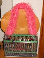 Bento used a hub, not a switch, and Erik Hendriks wanted to improve the design. The next system was called DQ. DQ was built in to an attractive metal CD case, suitable for carrying to any occasion, and especially suitable for long and boring meetings. As our Web page says, we'll let you figure out the meaning of the name. Hint: check out the beautiful pink boa carrying strap in the picture.