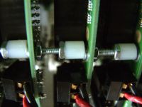 The spacer is a simple nylon spacer from our local hardware store. The bolts and nuts allow us to create an exact spacing between the boards. We needed the exact spacing for the next problem we ran into.