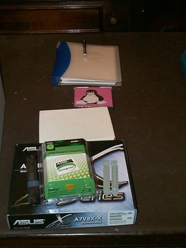I wanted a motherboard that didn't have on-board video. It may seem odd that I was willing to pay a little bit more not to get a certain feature in a motherboard. And, yes, a separate video card does add a few dollars to the total cost of the system, but it also bypasses some hassles. In my experience, on-board video motherboards tend to cut too many corners, resulting in lousy X performance and/or trouble with support under X. I ended up going with an Asus model A7V8X-X motherboard. It was about the least expensive motherboard that had everything I wanted--AGP slot and six expansion slots--and none of the stuff I didn't want--on-board video. The only small oddity with this Asus motherboard is the audio, which was not supported until the 2.6 series Linux kernels. This would be an issue, however, only if I planned to install an old Linux distribution.
