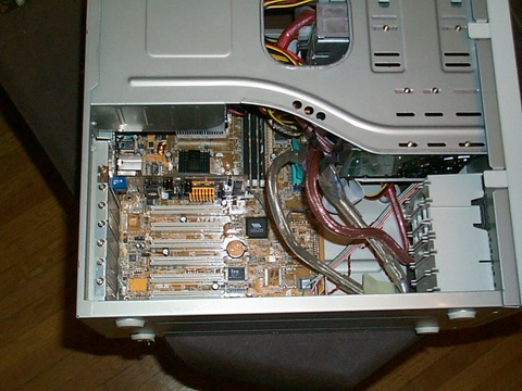 Figure 5. The motherboard returned to the case. The round hard drive cables are visible in the lower right-hand side of the photo.
