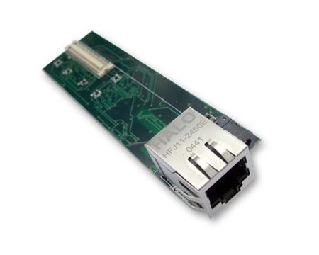 The etherstix board connects to the gumstix connex board through the 92-pin bus header, and the board is built around the SMSC LAN91C111 chip, which is a dual-speed, full-duplex switched Ethernet chip. The board measurements excluding the RJ-45 connector are 3.75" x 1.1" x 0.23" (95mm x 28mm x 6.4mm), and including the RJ-45, the board measures 4" x 1.1" x 0.75" (101mm x 28mm x 19mm). The board is fairly simple in that it includes the RJ-45, the SMSC chip, the support chips, 92-pin bus connector and finally the power connector.