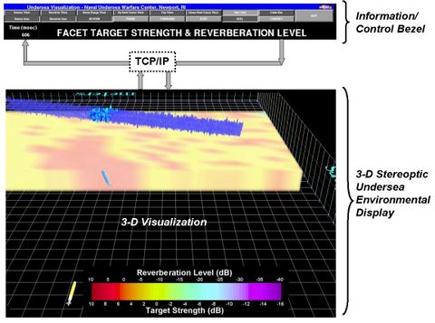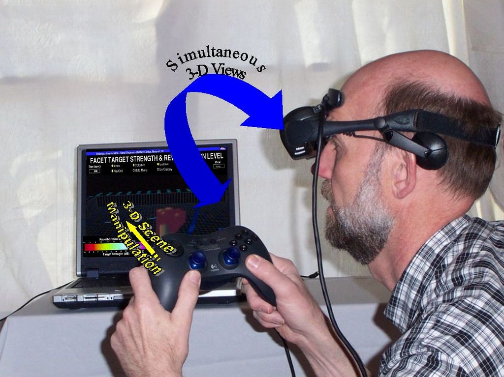When operating within a purely 3-D environment, the two-dimensional user interface becomes cumbersome. An elegant solution is to use a gestural interface in the form of a standard game pad with a sourceless inertial tracker attached. The object is to allow the user to position the viewpoint easily in any way. This functionality allows the user to better understand the complex visual representations of target strength and reverberation levels. Figure 9 demonstrates a prototype of the next step in the evolution of the UEV software.