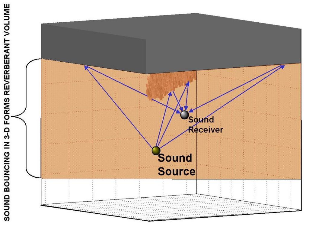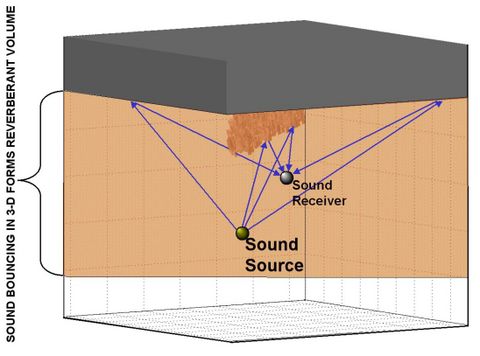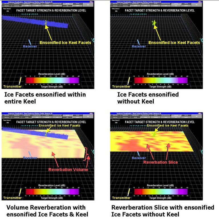 Acoustic reverberation, which also could be called unwanted sound noise, simply is the re-echoing caused by sound bouncing off surfaces in all directions. In the case of the under-ice environment, these surfaces are the ice canopy and ice keels (Figure 4). Because sound energy bounces off objects three-dimensionally, it can be represented as a volume. This volume is referred to as the reverberant volume and can be represented in 3-D by individual volume elements, called voxels. Each voxel is color-coded to match the intensity level of the sound energy reaching it. Similarly, the intensity of the sound energy bouncing directly off the embedded ice blocks, called acoustic scattering, also is color-coded for intensity. The central idea behind the UEV software is to create an animated display that enables the user to interpret better the behavior of ice block scattering, as well as some of the space-time properties of the reverberant volume.