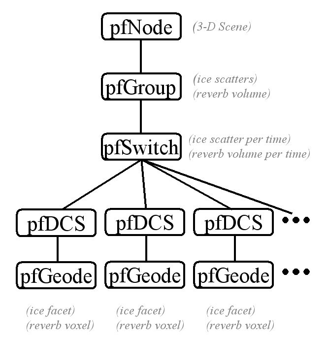 Individual nodes within the scenegraph represent the 3-D display of the information of interest, that is, the acoustic scattering from the surfaces of the ice blocks. Each block is formed as a six-faced polygonal surface, with each face colored to represent the target strength of the acoustic scattering from that face. To conserve memory and decrease rendering time, only those surfaces above a predetermined threshold are lit for any given acoustic scatter time interval. Turning the faces of the keel on or off is accomplished through the use of switches attached to each facial node. The reverberation associated with a given acoustic scatter interval is represented by a color-coded volume consisting of thin stacks of voxel volumes representing the reverberation for a given water depth. Again, these component reverberation volumes are addressed individually as nodes within the scenegraph. Figure 5 graphically illustrates the code snippets for the nodal structure of the ice facets and reverberation volume given in Listing 2. The advancement or regression of the acoustic scatter-reverberation display is controlled by the bezel. The display can be set to either continuous update mode or manual step mode. For any given time interval, the user can view any combination of ice block scattering and reverberation information, including blocks ensonified, lit within the entire ice keel; only the ice blocks of interest lit; the entire reverberation volume; or a user-selected depth slice of the reverberation volume.