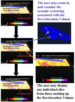 The 3-D scene navigation also allows the user to zoom in and manipulate a particular region of the acoustic environment of interest. This data mining allows for a better understanding of what processes are occurring in a particular region. Figure 7 illustrates a zoomed view of the target strength for the region of an ensonified ice keel. Notice that the scene can be manipulated by the user and viewed from several different angles. Figure 7 also illustrates the building of the reverberant volume for the same acoustic scatter interval, as well as the selection of a single reverberation slice for display.