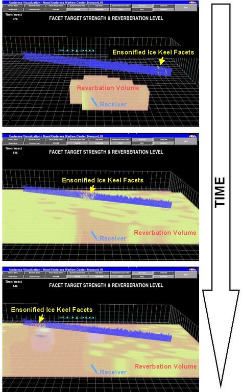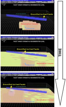 Finally, the user can observe the simultaneous evolution of both the target strengths of the faces of the blocks composing the ice keel and the accompanying water reverberation. Figure 8 illustrates the progression of the acoustic signal down a length of the ice keel and the accompanying reverberation at the receiver, in this case a submarine's acoustic system.