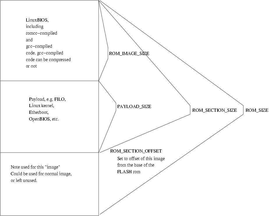 You can see that code in there even now. This maps in the FLASH at the 32MB location. Next, we set up LinuxBIOS so that the GCC payload is uncompressed. How do we do this? First, we need to explain memory layout. A number of variables control Flash layout in LinuxBIOS, as shown in Figure 2. Notice that each set of variables can be changed for each payload. In our example, at this point, we are using only one payload, so we show the variables for that case.