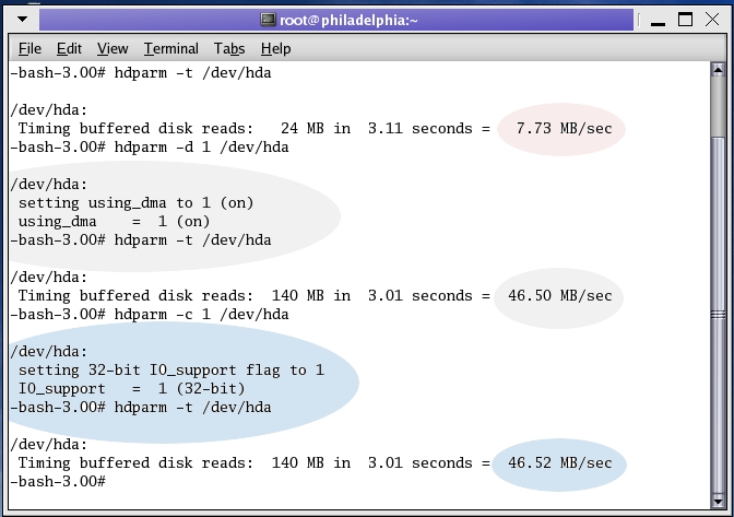 When I ran the command hdparm -t /dev/hda, my disk read 24MB in 3.11 seconds, which does not provide for the best disk access. So, I turned on using_dma using the hdparm -d 1 /dev/hda command and found that my disk access increased from 24MB in 3.11 seconds to 140MB in 3.01 seconds. You can see the results in the gray area of Figure 1.