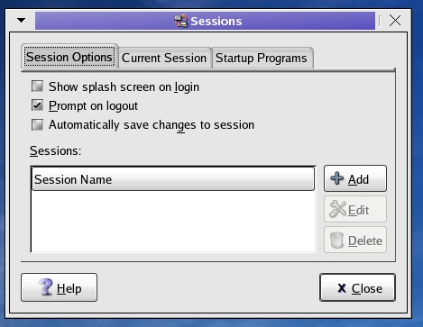Notice that you have several options from which to choose in the Sessions tool. Later, we use the third tab, Startup Programs, to show you how to load a script to improve the start-up time for OpenOffice.org.