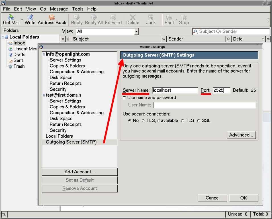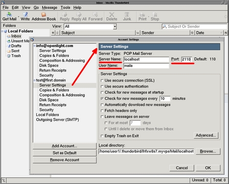 If you use Mozilla Thunderbird, select Account Settings... from the Edit menu. Add a new account by clicking the Add Account... button in the dialog box, and follow the prompts in the Account Wizard. After you create the new account, click on its Server Settings list item in the left pane to configure the POP3 server and port. Figure 1 shows the screenshot. Red-colored highlights indicate the most important parameters.