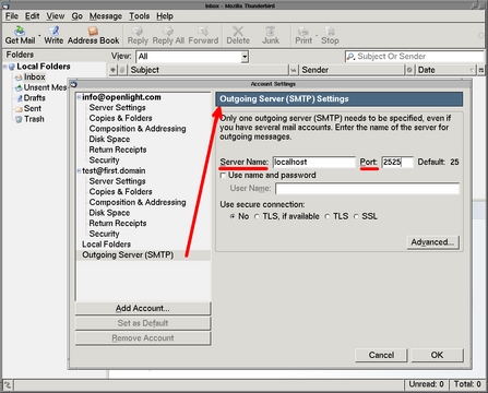 You also can configure Thunderbird's outgoing mail server from the same Account Settings dialog box. Click on Outgoing Server (SMTP) in the left pane of the dialog. Figure 2 shows the resulting screenshot. Remember to uncheck the Use name and password check box.