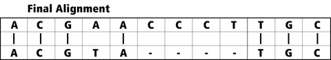 Smith-Waterman formulates matches by first creating a scoring matrix and calculating each cell according to the value of cells above and to the left. Once this matrix is created, the algorithm calculates a maximum score, traces back along the path that led to the score and delivers a final alignment (Figures 2 and 3).