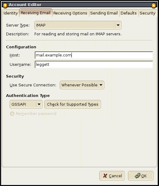 Our ultimate goal is for users to have to type their password only once per day and never have that password go across the wire. So why go through all this trouble if your users are sending their password over the wire every time they check e-mail? Fortunately, more e-mail clients are starting to support the GSSAPI mechanism. Unfortunately, if you're a Mozilla Thunderbird user, you're out of luck (as of this writing). A few other options exist, however; for example, both KDE's KMail v1.8 and Ximian Evolution v2.2 have GSSAPI support. I've never used KMail, so I'll stick to what I know. Configuring Evolution to use GSSAPI is simple. Just select GSSAPI as the authentication type under both the Receiving and Sending Email tabs (Figure 1). If you set the Use Secure Connection option to Whenever Possible, Evolution uses StartTLS to secure the data transport.