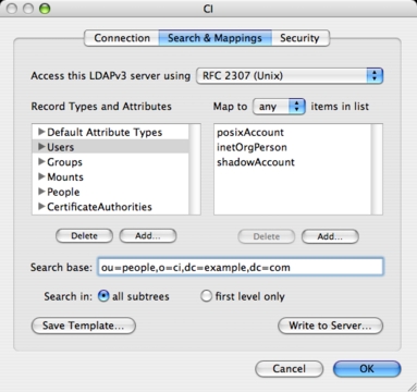 You can refine how Directory Services searches the directory, much as you can with /etc/ldap.conf under Linux. If you highlight the directory service and click Edit, it brings up some more advanced options. Click on the Search & Mappings tab. There you'll see a list labeled Record Types and Attributes. For each of those you can select and then define a more specific Search base (Figure 3). Click Ok twice, and then Apply to save your changes.