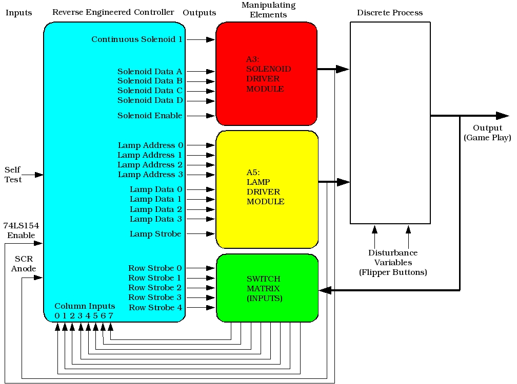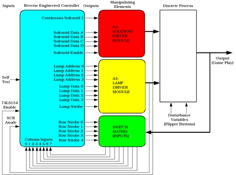 What differentiates this project from the typical emulator is that no reference is made to the original programs encoded on the MPU firmware. Instead, I employed a black box, or clean room, method based on studying their function rather than their internal structure. For me, it made sense to interpret these 66 electrical connections in terms of their purpose in a closed-loop process control model. That is, each is either input, output, part of a feedback circuit or part of the power supply. The four main divisions of the pinball machine control system are the solenoids, switch matrix, feature lamps and digital displays. I intentionally left out the digital displays for the first prototype, which is why the apparatus uses the computer monitor to show the scores. The analysis yielded the process model shown in Figure 2.