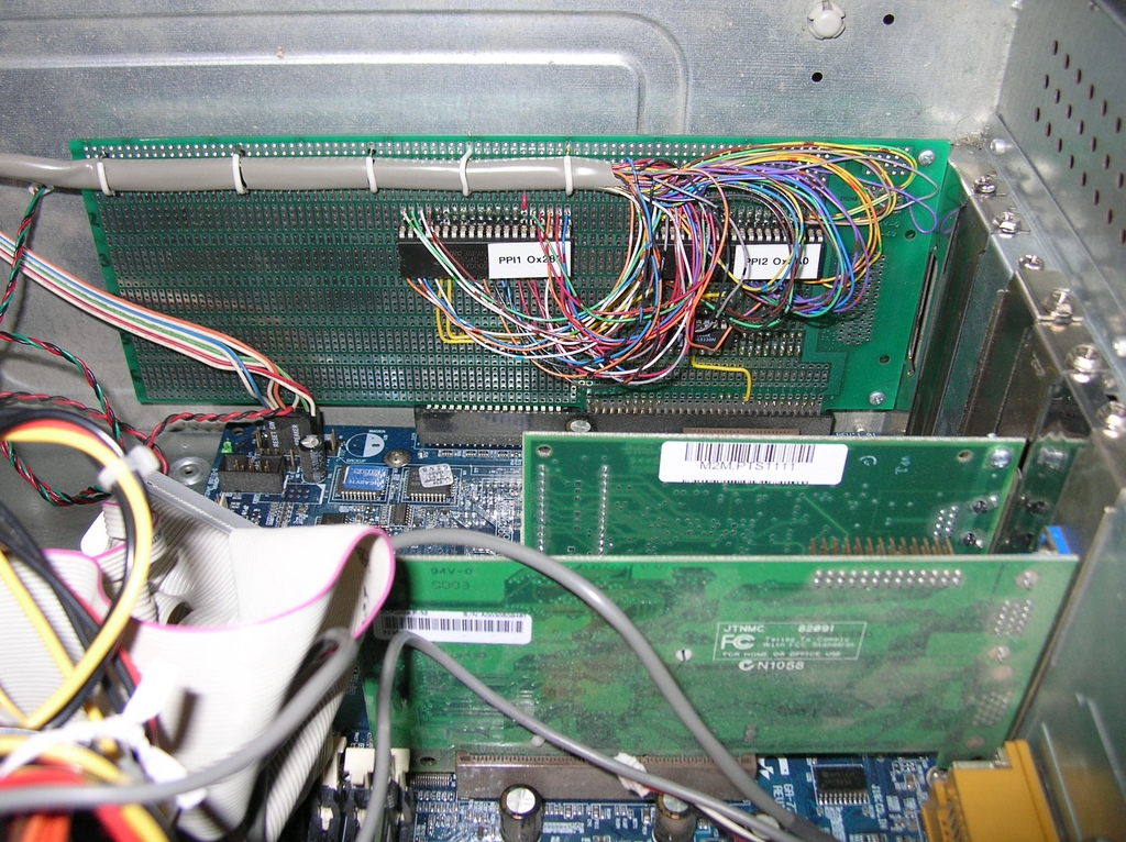 Facing a total of 11 inputs and 20 outputs, and wanting room to grow, I decided to build a 48-port digital I/O board. Designs can be found with a little Web searching, and the components can be ordered from Jameco. The Intel 8255 Parallel Peripheral Interface (PPI) integrated circuit provides two 8-bit ports and two 4-bit ports, each configurable as either input or output. On my board, I hard-wired two of these ICs to addresses 0x280-0x283 and 0x2A0-0x2A3. The first three bytes of each are memory-mapped to the aforementioned ports. The fourth byte is used to control the port settings. I used a ten-foot piece of 25-pair twisted pair cable to connect it to the interface board via screw terminals. It's definitely a hack, as Figure 3 illustrates. You may want to use a 50-conductor SCSI cable and header pins.