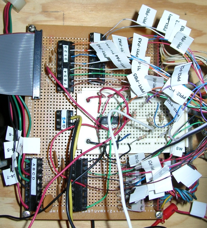 The AS2518 MPU is based on the Motorola 6800 microprocessor. It uses two 6820 Peripheral Interface Adapters (PIAs) to provide I/O to the rest of the system. The Intel 8255s are functionally similar. What must be duplicated on the interface board are the circuit elements between the PIA I/O lines and the header pins. These are determined through direct inspection and study of the electrical schematics accompanying the patents and the operator manuals, and consist mainly of resistors and capacitors. A picture of the board I created is shown in Figure 4. A label maker works great for marking wires and connectors.