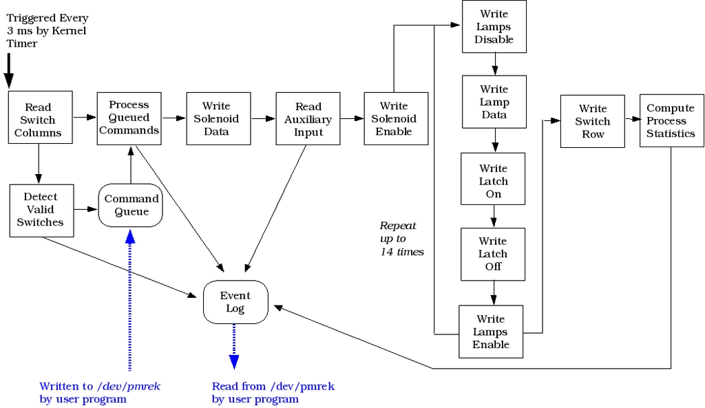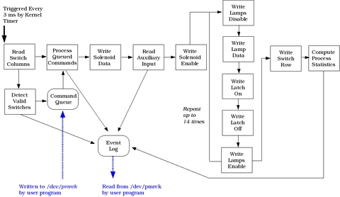 Not everything in the pinball machine control system has to execute as frequently as the low-level hardware I/O operations. Game play itself—how the machine responds to switch detections, lighting different lamps and incrementing the player scores—operates just fine as an ordinary user process. In a sense, it is really a supervisory controller of the low-level I/O processing.