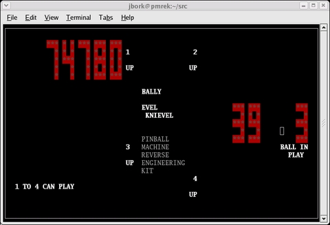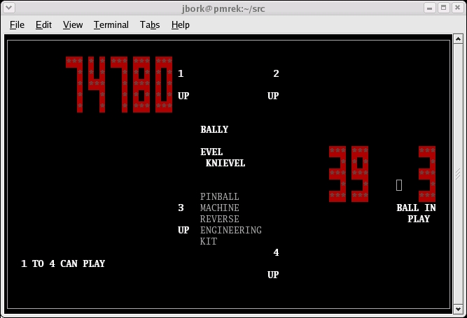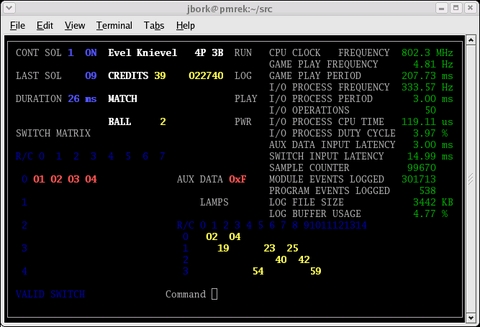 You are free to modify the C program testbed.c I wrote for Evel Knievel. It uses the ncurses screen handling package to provide a console color display and user input. A diagnostic display shows the disposition of the switch matrix, the lamps and the most recently fired solenoid. It also shows the player scores, as well as run-time statistics such as the average cycle frequency and execution time of the kernel workqueue process. Keyboard commands can be entered to turn the continuous solenoid on or off, fire momentary solenoids, turn feature lamps on or off and adjust the workqueue delay. Figure 6 shows a game in progress. Note the closed switches; these are drop targets that have been struck.