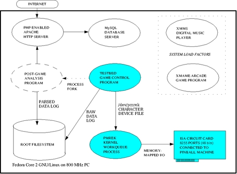 We took the game to Pinball at the Zoo in Kalamazoo, Michigan in April 2005. Hundreds of people played the game, which collected statistical data that I used in my Master's thesis. After each game completes, a PHP program reads through the log file created by the game program. It generates an HTML document summarizing the event history of the game and statistics about its real-time performance. These results are then stored in a MySQL database to facilitate analysis of overall performance. Figure 8 is a block diagram of the setup. Figure 9 shows the game in action.