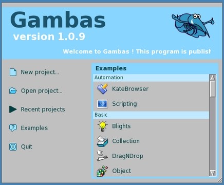 With that, you're ready to use Gambas. Type gambas on the command line, and the welcome screen appears (Figure 1).