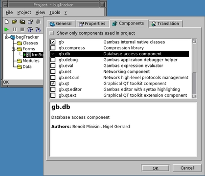Now that we've built and loaded data into the database, the first thing to do is to connect to it so we can start communicating with it. Gambas makes this very, very easy for us. It comes with components, and all we have to do is tell the application to use the appropriate component for connecting to databases. We will have to do a little coding as well, but that is easy too.