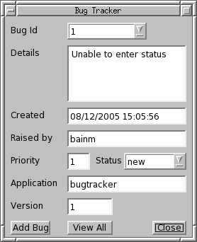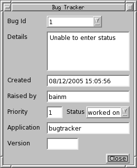 Now we can click on the combo-box to select the required bug ID, and use this to run another query in order to view the particular details. To do this, we need a text area (txtDetails) and some text boxes (txtCreated and txtRaisedby, txtPriority, txtApplication and txtVersion).