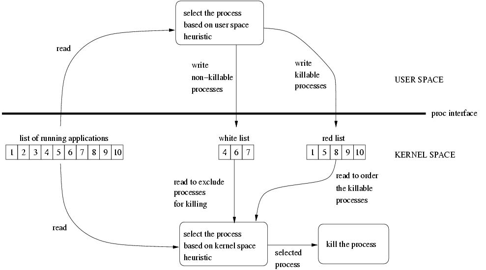 The Red List and White List could be implemented in kernel space, with each list also reflected in the /proc filesystem. ST can be used to notify user space the moment when the Red and White Lists should be updated. Afterward, the kernel can start terminating applications registered on the Red List in order to release memory. Perhaps a ranking heuristic can be employed in kernel space to prioritise entries on the Red List. Figure 4 illustrates a possible architecture of OOM killer, based on Red List and White List approach. If it is not enough simply to kill processes on the Red List, other processes, not appearing on the White List, could be killed as well, as a last measure to ensure system stability.