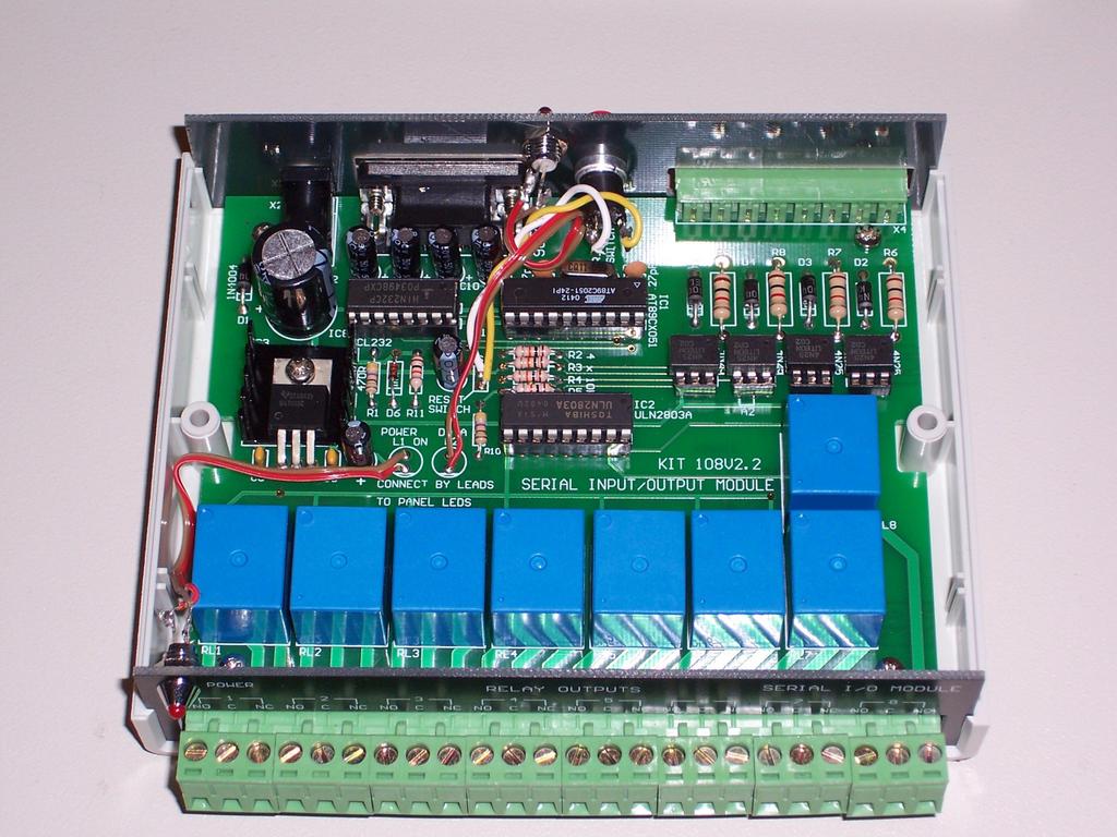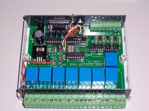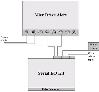 The Python home automation system is centered around an Isolated Serial I/O Kit (Figure 1) from Quality Kits, which is available assembled for an extra $10 US. The kit contains four inputs and eight relays. The inputs detect DC voltage from a source within the 6-24 volt range. The relays can be used to turn voltage to a source on or off, so they can be used to control the power to multiple 12v light bulbs or any other gadget that requires DC voltage within the relay's specified voltage range. The Serial I/O Kit uses simple read and write commands to a serial port connection for setting the relays and monitoring the inputs. The inputs and relay circuits are isolated, which means there is no direct connection between these circuits and the computer's serial connection. This prevents damage to the computer if something goes wrong with the Serial I/O box. Figure 2 shows how to connect the Mier Drive Alert and alarms to the Serial I/O box inputs.