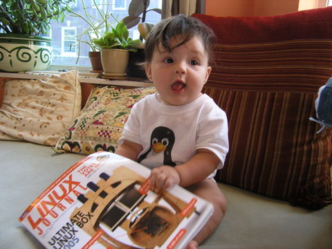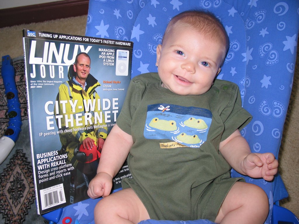 Our son Sam is excited about being a member of the Linux generation.
