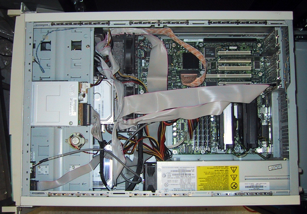 Figure 1. Storage array build from an old server (capacity of nine IDE disks, including five in a converted SCSI RAID stack). Additional IDE spots added with Promise HBA.