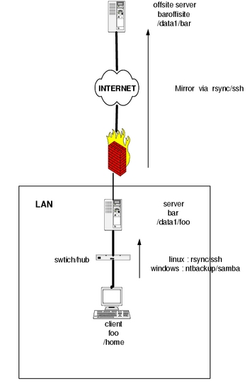 Figure 2. Example backup scenario with client foo, backup server bar and off-site mirror baroffsite.
