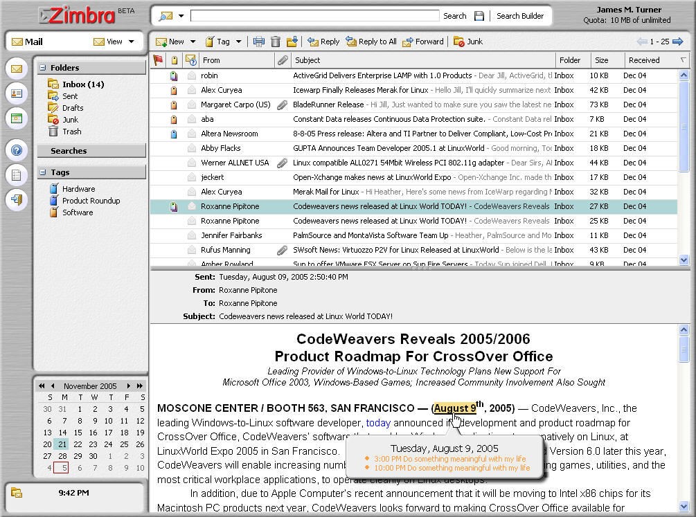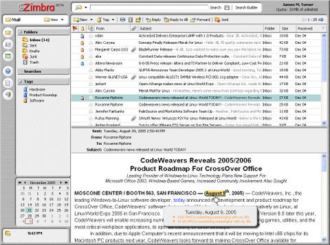 There's no question that the Zimbra Web-mail interface is both more featureful and colorful. For example, put your mouse over a date and you see the calendar for that date. Mouse over an e-mail address, and you see the contact information for that person. Mouse over a Web address, and you see a thumbnail of the site. Unfortunately, it's still a bit glitchy, especially under Firefox. This is not a good thing for a product that wears an open-source pedigree so proudly. Hopefully, these issues will be resolved before the final release.