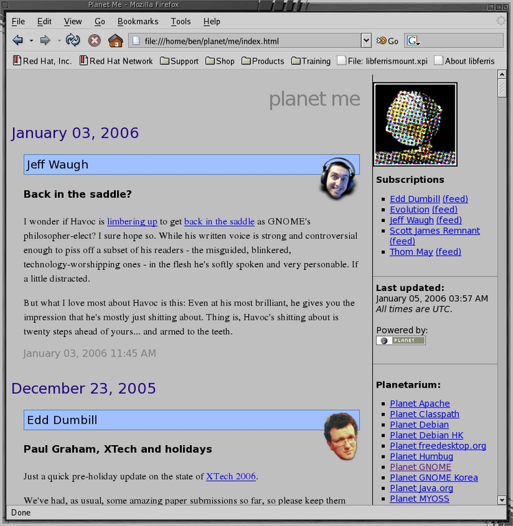 The two final commands in Listing 1 show how to fetch current news feeds and set up your initial Planet. The commands will vary depending on things such as whether or not you have to use a proxy server to access the Internet. After running these commands, you should have a Planet Me viewable in your Web browser at ~/planet/me/index.html. After doing these steps, your planet should look similar to Figure 1.