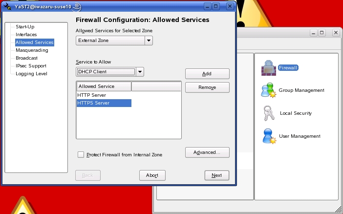 You're also given the opportunity to enable local firewall scripts (enabled by default), and the SSH and VNC remote-shell daemons (both disabled by default). Note that of the latter two, SSH is the best choice for administering bastion hosts (hardened Internet servers)--among other reasons, you shouldn't be using the X Window System on bastion hosts unless you've got a very specific, very compelling reason. YaST, it should be noted, runs perfectly well in text (ncurses) mode, with exactly the same modules and options as the X version. Also, tightvnc, the version of the VNC remote-desktop tool shipped with SUSE, doesn't encrypt session data, only authentication data.