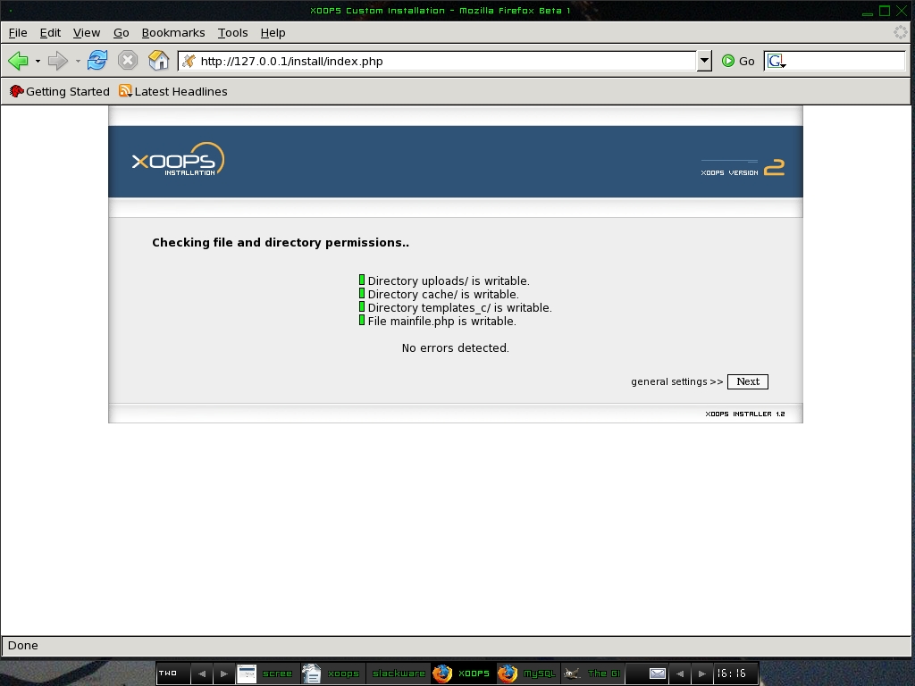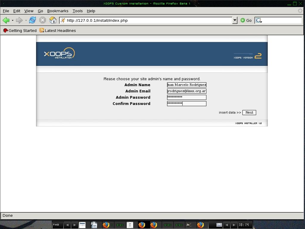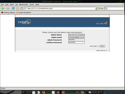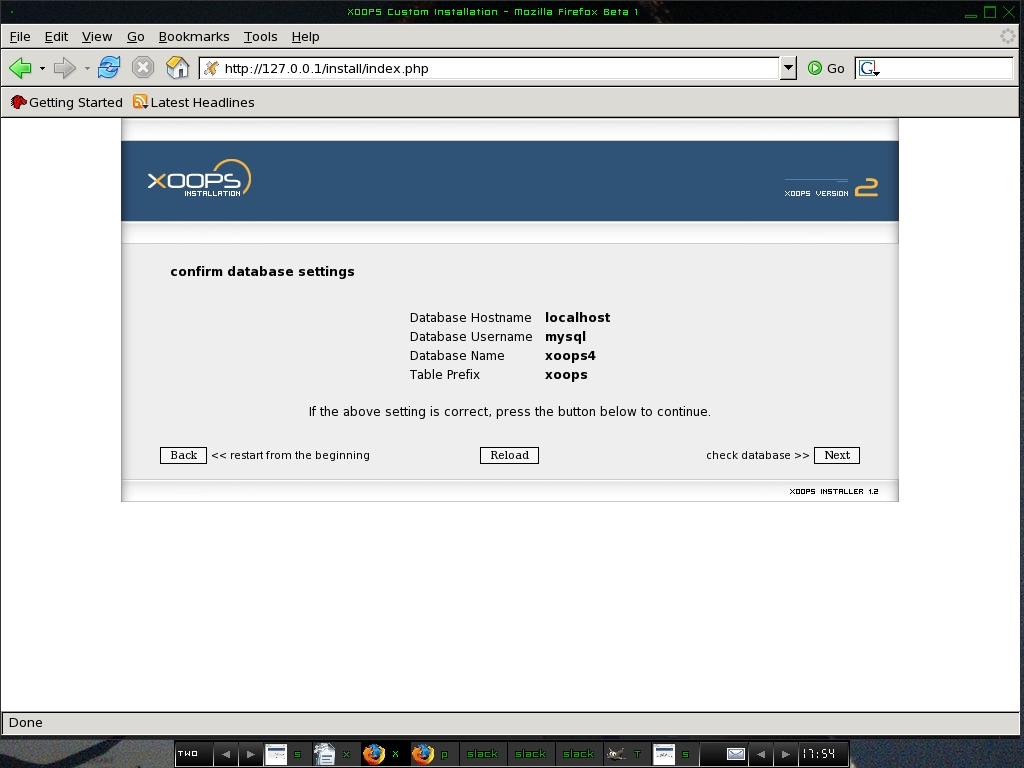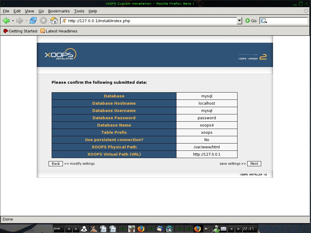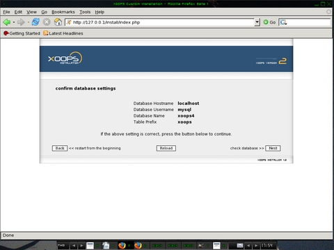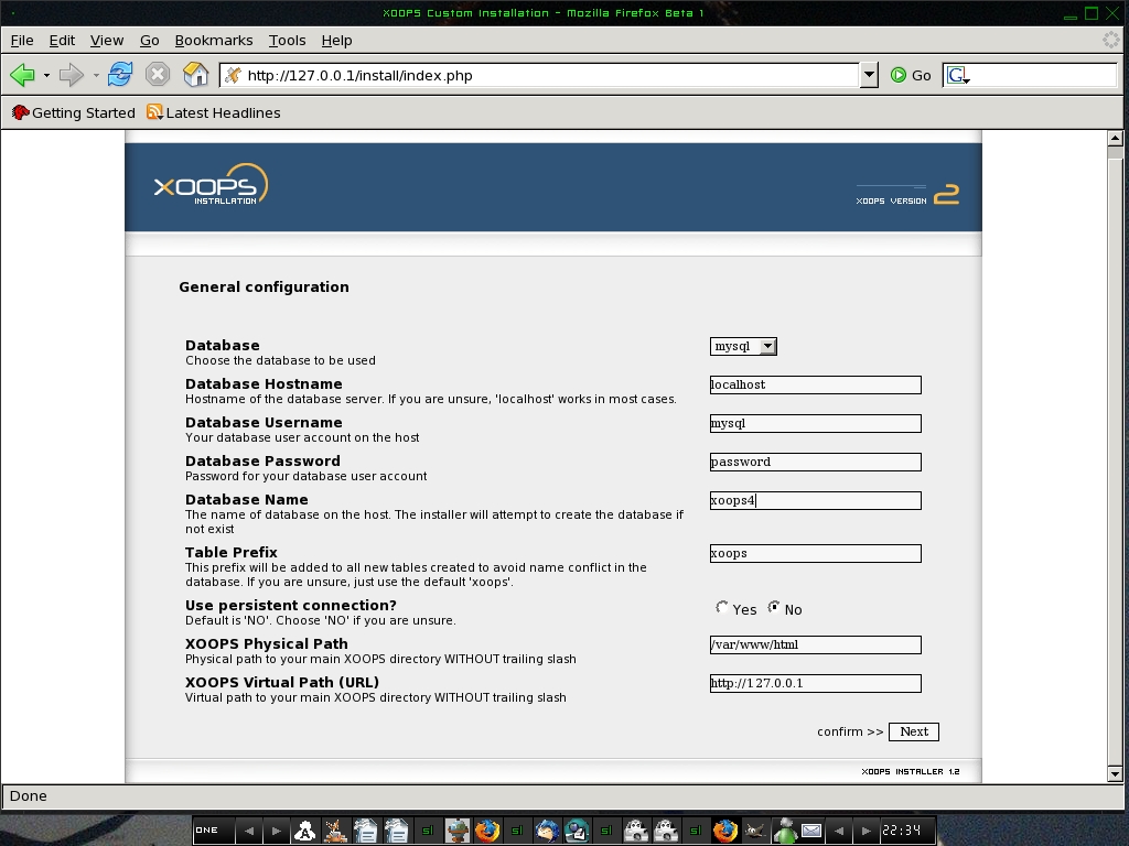 Press the Next button again. Before we explain how to fill in the next page, you need to create the XOOPS MySQL database and a user name and password for that database. Open a console or an X terminal, and run the following commands: