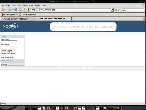 Press the HERE link to get to the login screen for your site. This is actually what your site looks like when you first start XOOPS. It is obviously bare bones, but that is because you haven't activated any of the XOOPS features yet.