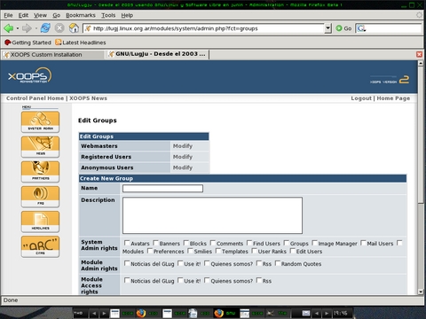 There are cases where you might want to restrict who gets to see or use blocks. You do this by defining groups of users and assigning people who register for your site to the various groups. You can set, modify and add groups through the section Groups in the Administration menu (Figure 19).