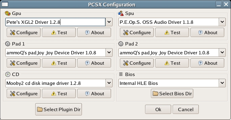 The plugins I selected were Pete's XGL2 Linux GPU (video), P.E.O.P.s Linux OSS SPU (sound), CDR Mooby Linux (to use ISO files of my games instead of the CDs) and padJoy. If you want to learn more about any of the plugins, click the home icon next to the entry in the listing. Otherwise, click the disk next to it in order to download the file. Either save them directly into the Plugin subdirectory (for example, ~/Downloads/Pcsx/Plugin), or copy them there once you have them downloaded.