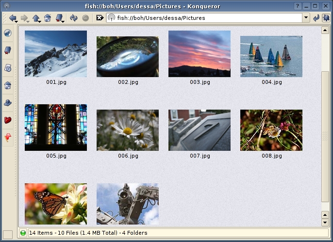 One of the areas where fish really shines is the way it lets you preview remote files in much the same way you would preview local ones. KDE's preview mechanism is flexible and powerful, enabling you to see previews of images, PDF files, fonts and office documents as well as listen to previews of audio files.