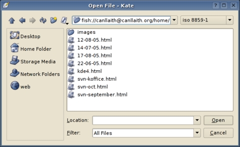 To open up all of the HTML, CSS and other files associated with my Web site in Kate, I can drag and drop them from an open Konqueror window showing me a fish session to the remote host. Dragging and dropping multiple files in this way causes them to be opened as separate files that I can navigate between in the Documents pane.