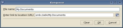 As well as adding shortcuts to the File dialog, you also can add desktop shortcuts to hosts you want to access frequently. To create a desktop shortcut to an smb URL, right-click on the KDE desktop and select Create New→Link to Location (URL)... from the context menu. Fill in the smb:// (or fish) URL to the share to which you want to create the shortcut in the box labeled Enter link to location (URL):. KDE fills in the filename box with a suitable name, or you can choose your own. Click OK and you're done.