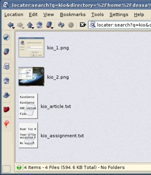 locate: Kubuntu includes kio-locate by default, and you can download the sources for other distributions from KDE-apps.org. kio-locate is a kioslave for locate or slocate. Typing locate: query term into any KIO-enabled field displays the results from the locate database. This is immensely convenient when combined with the File dialog. Want to open that budget spreadsheet in KSpread, but you realise you can't quite remember where you saved it until after you've launched the application? Without having to leave the File dialog, locate:/ comes to the rescue.