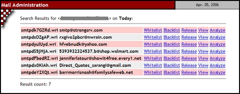 If these checks are successful, the script responds by showing users the requested day's spam in a table format with a list of option links on the side of each item (Figure 3). Users then can use the option links to have the script release the spam, whitelist its sender, blacklist its sender, produce a SpamAssasin report or simply display it as plain text. The script looks up the user's SSC information each time it's called and before any action is performed so that it knows whether or not to allow that action. I won't get into more detail here, because the functions of this script consist mostly of just moving files around in response to users' requests. I do want to mention the whitelist and blacklist options though.